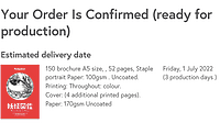 Hi there! The package with the printed zines arrived a week ago, as expected. The print quality is really nice, but there was a little problem in the trimming process. Nothing huge as no text was cut...